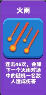 技能说明:当达成联机奖励时,会向场上一名敌人降下火雨。此技能还能够触发火焰球伤害以及具备火焰精通的特殊能力。