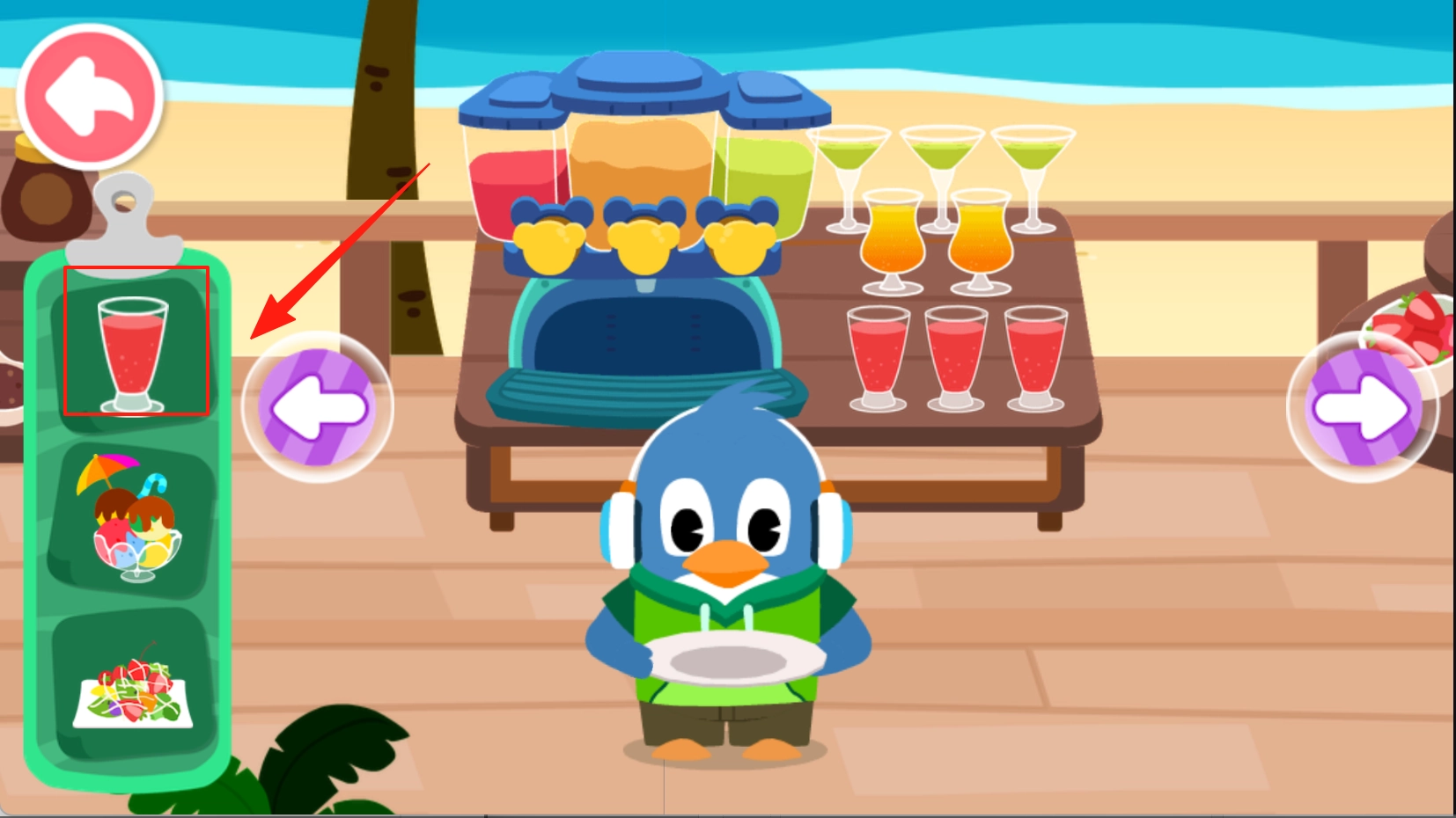 3、点击屏幕左边你喜欢的一款饮料,小动物会自动走到制作区域。