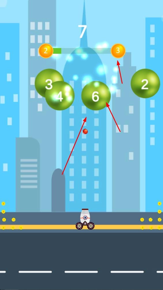 1. 在城市场景里,拿起炮弹发射器,对准绿色泡泡发射炮弹,把泡泡击碎,进而获得分数。