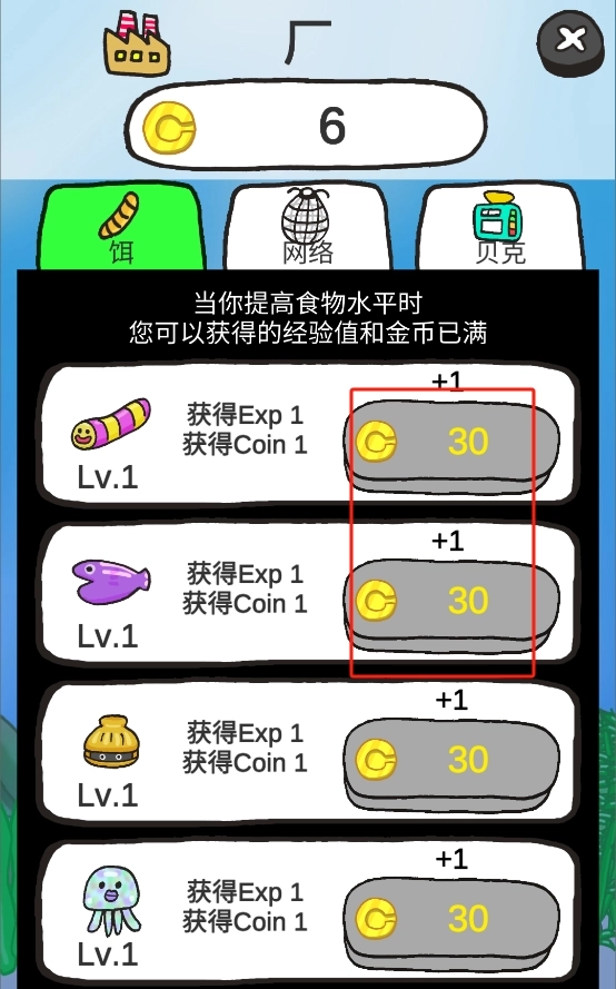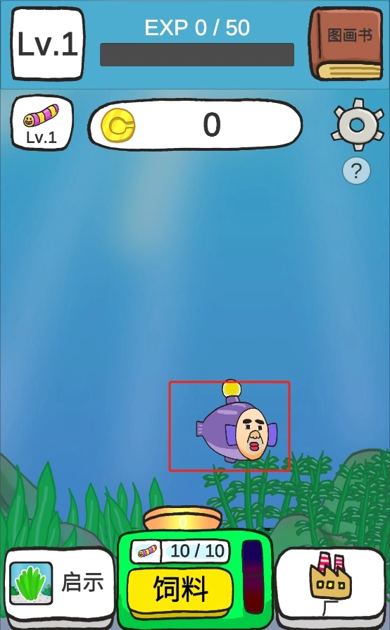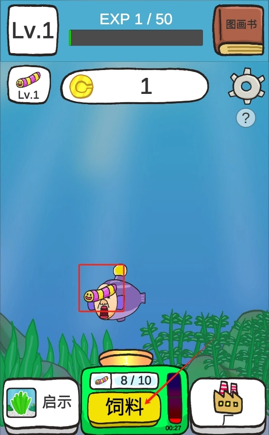 1. 进入作品后,点击底部绿色的饲料按钮,给紫色鱼类投喂食物,以此积累经验与金币,促使等级提升。