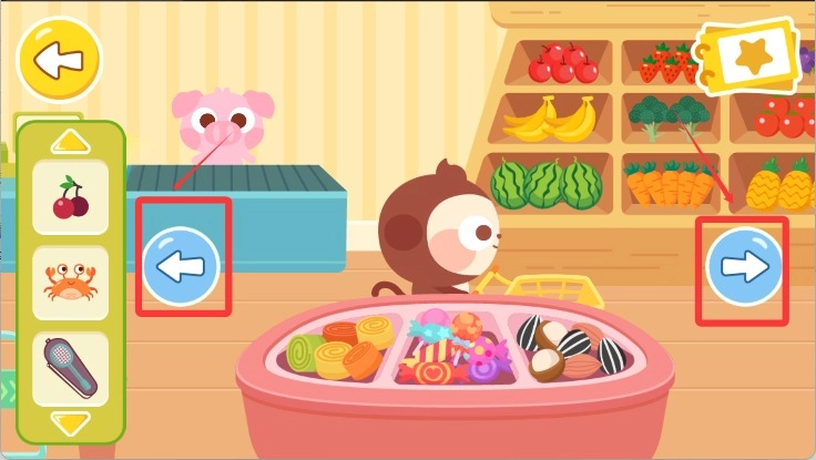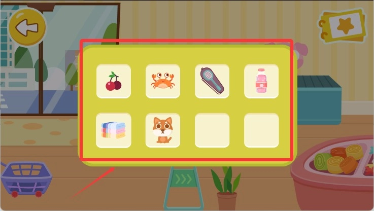 1. 孩子打开应用后,首先阅读购物清单图示,接着在各个大的区块里找寻对应的商品,通过点击或者拖拽的方式,完成挑选商品并放入购物篮的操作。