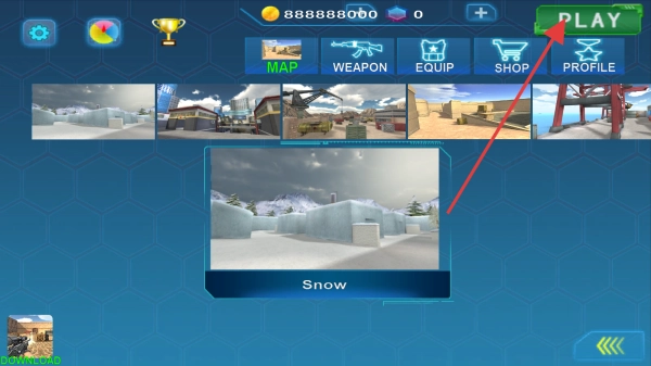 2. 在游戏准备界面,点击“PLAY”按钮即可进入游戏地图。在此之前,玩家可预先熟悉诸如“MAP”“WEAPON”等功能选项,做好充分准备。