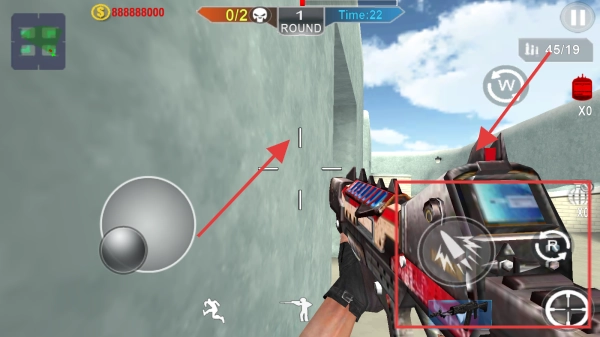 3、踏入游戏对战场景,通过左侧的移动摇杆来操控角色移动,借助右侧的按键执行射击、换弹等动作,同时留意上方显示的时间以及剩余敌人的数量。
