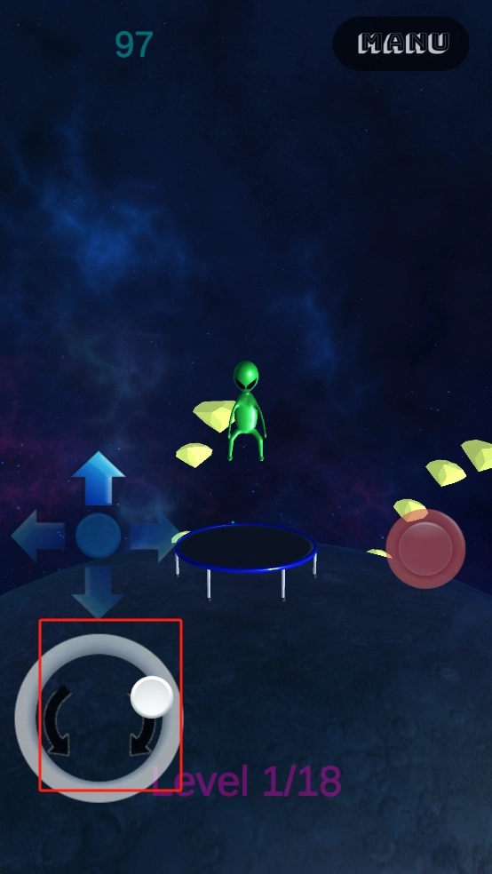 1. 通过操控左下角的环形按键来旋转外星人的朝向,与此同时借助中间的方向键对位置进行调整,让外星人能够落到蹦床上,并且在此过程中要瞄准周围的黄色晶体,做好收集的准备。