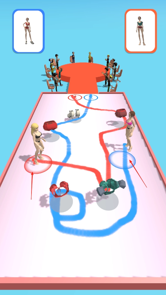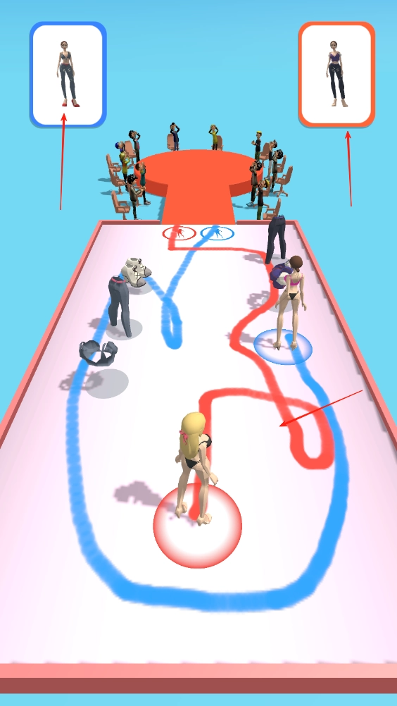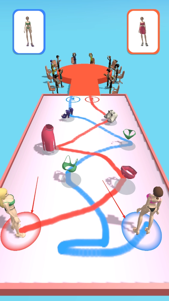 2、务必仔细分辨两个女孩需穿着的服饰,它们极易混淆。参照图中所画线条,帮两个女孩穿上正确的服饰,随后引领她们走上T台。