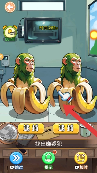 2、依据任务目标的提示,本关卡的任务是找出嫌疑犯。关卡画面呈现出两只被香蕉皮包裹的拟人化猴子,这属于找不同或推理辨别类型的关卡,玩家需要找出猴子之间的差异,以此来确定谁是嫌疑犯。