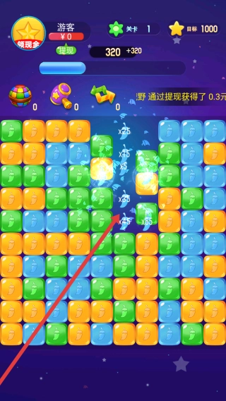 2、点击同色方块进行消除,会引发连锁反应,大量方块随之消除,分数也会快速增长。目前你已获得320分,持续操作还能解锁更多消除特效,助力你朝着目标不断迈进。
