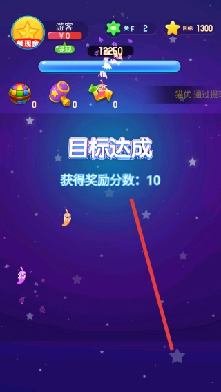 3、顺利完成关卡1的目标,进而进入关卡2,同时获取10分奖励。此刻,新的挑战目标为1300分,需依靠消除策略持续推动游戏向前发展。
