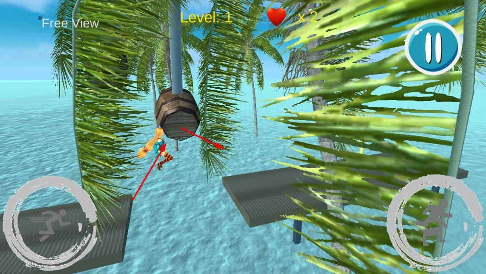 1. 在平台上操控角色移动,利用左侧按钮实现奔跑控制,右侧按钮则用于控制跳跃。