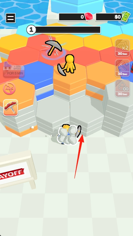 2、在操作过程中,操控角色携带矿石,朝着红箭头指示的区域移动,为售卖等操作做好准备。