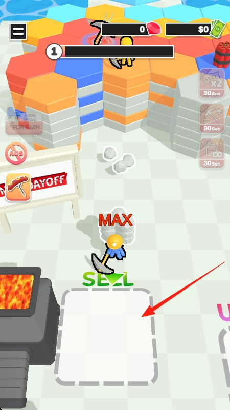 3、把矿石拖进红箭头所指的机器,完成交易就能获取金币。金币可用来升级工具或者解锁新功能,从而推动游戏进程。