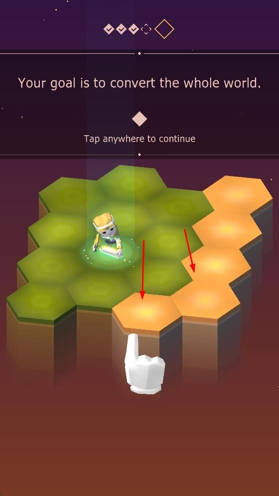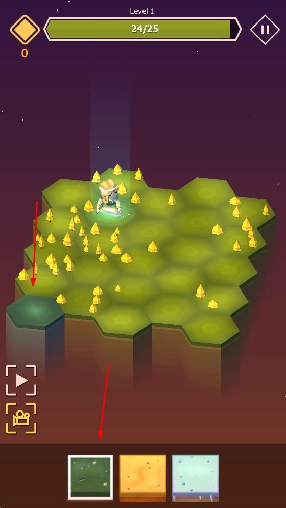 2、操纵角色移动至橙色、绿色等各类六边形地块,依据地块类型做出相应转化选择。