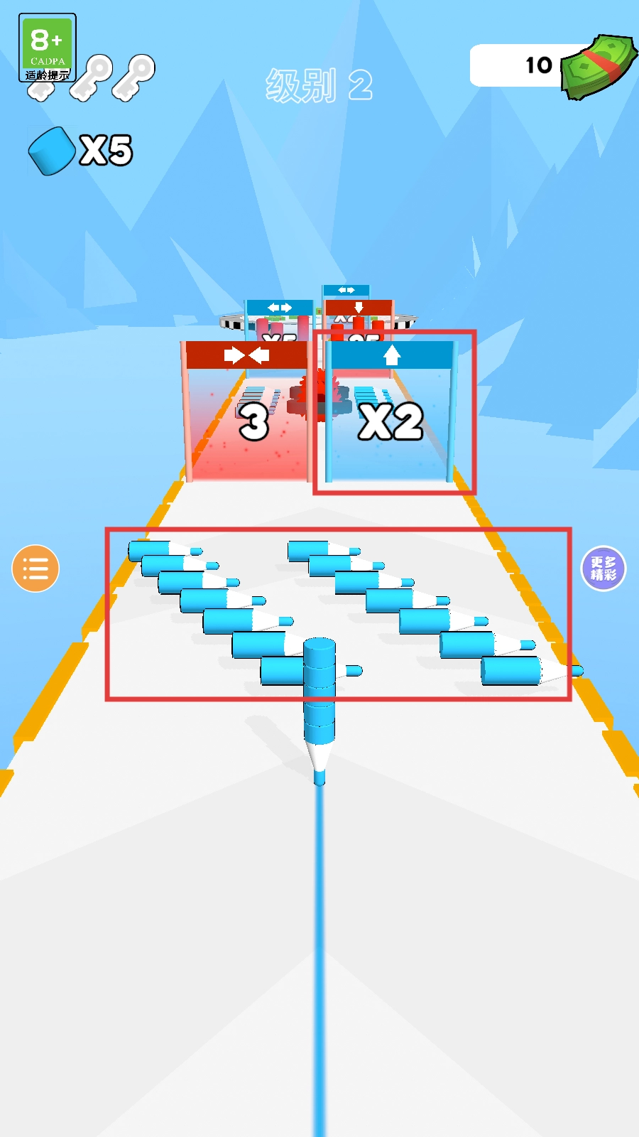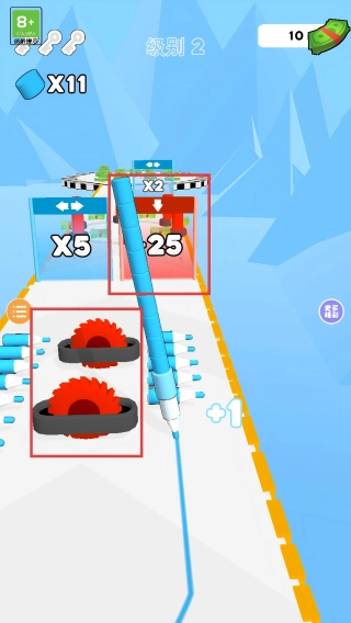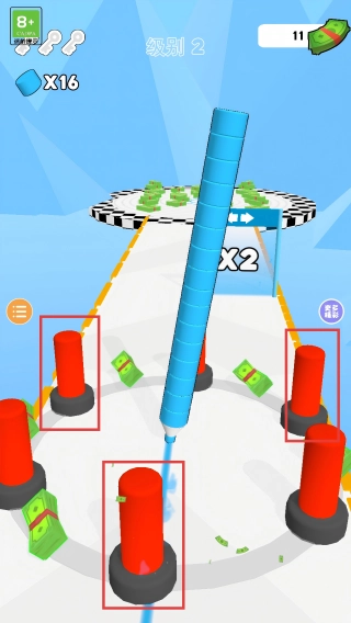 1. 通过左右滑动屏幕,使笔尖切换跑道,要优先穿过【X2】通道,同时收集通道两侧的蓝色笔,让笔堆变得更长,为后续操作提供助力。