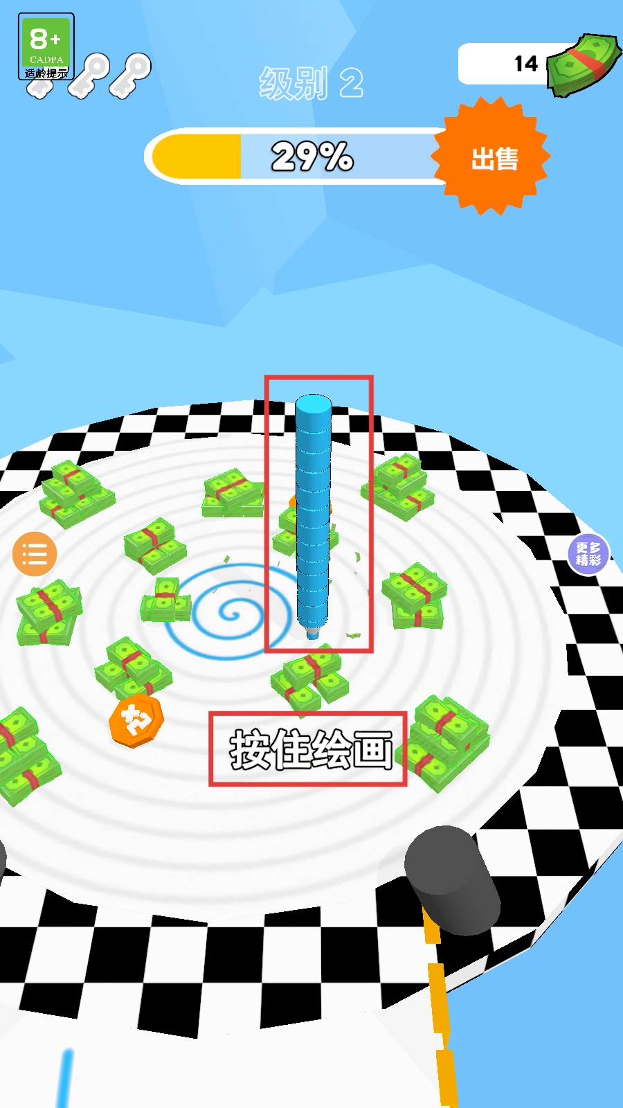3、于圆形区域内,避开红色圆柱,尽量多地拾取绿色钞票,使笔尖平安到达终点。