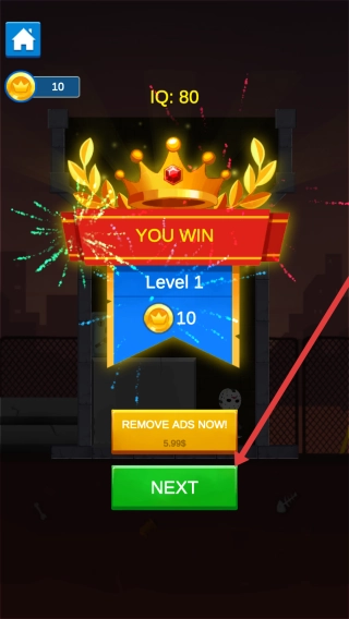 3、当成功通过Level - 1关卡后,只需点击“NEXT”按钮,就能领取10金币奖励,并接着挑战下一关的游戏内容。