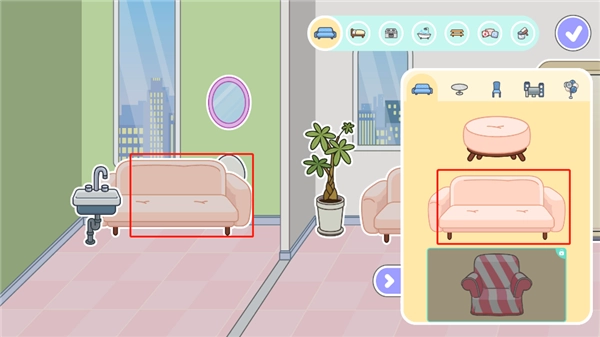 4、这里面为用户提供了极为丰富的家居,像沙发、桌子、洗手台、床、浴缸等,玩家能够自行挑选自己想要的家居。
