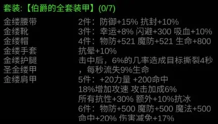 版本真神降临,失落手单件提供11%魔法免伤,基本能一直用到毕业。集齐4件套更是厉害,能获得27%物理免伤以及38%魔法免伤。
