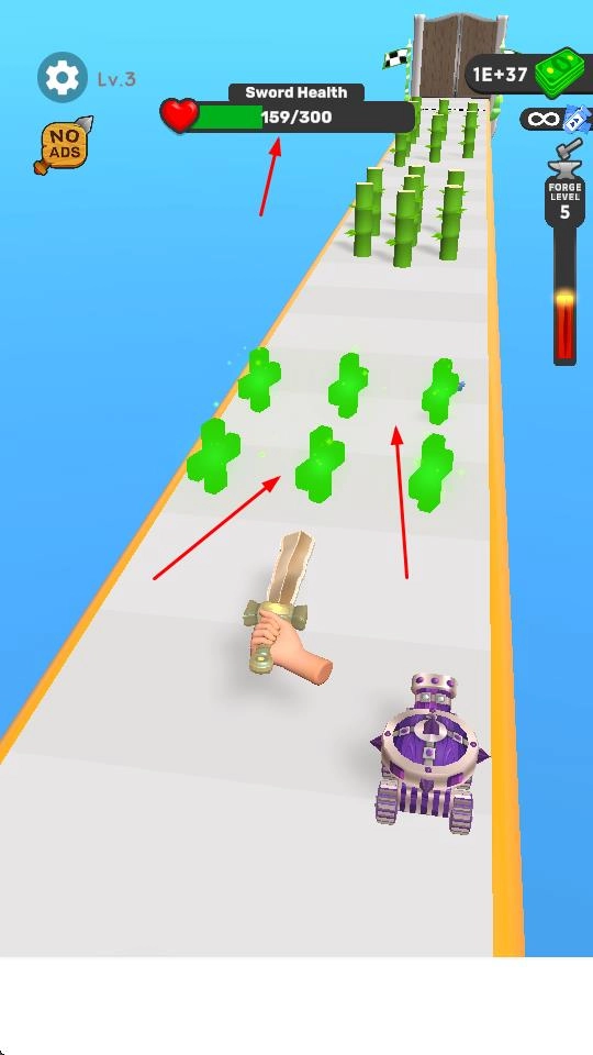 3、于跑道之上,会邂逅绿色十字等道具,一旦接触,便能恢复刀剑的耐久度,为持续战斗与前行提供助力,进而提升游戏的续航能力。