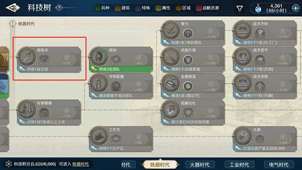 优先解锁炼铁术相关科技,迅速开展军事培训,增强军队实力,继而持续率领军队拓展领土以获取资源。
