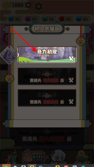 1. 挑选初入奇猫国关卡,此关卡为游戏的起始关卡,顺利完成该关卡后,就能解锁后续关卡,从而开启奇猫国的冒险旅程。