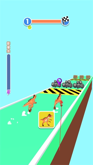 1. 在赛道上控制恐龙前行,当碰到障碍物时,点击下方恐龙图标来切换恐龙,借助不同恐龙的能力进行躲避,并且要时刻关注左侧的能量条。