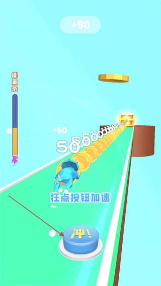 3、当看到“冲!”按钮时,快速连续点击此按钮,使恐龙加速前进,与此同时,收集赛道上诸如金币之类的奖励。