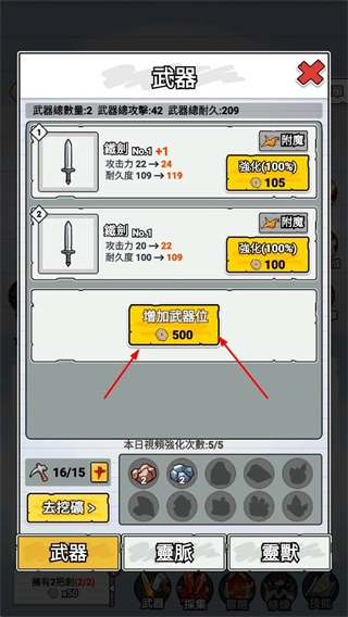 1. 于武器界面进行武器强化操作,以此提高武器的攻击力与耐久度,并增多武器数量。
