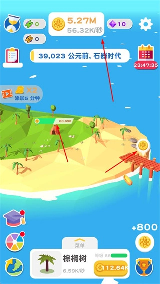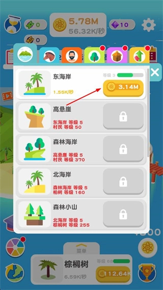 1. 轻点岛屿上的资源点来收集金币,与此同时对建筑进行升级,以此提高资源产出的速度。