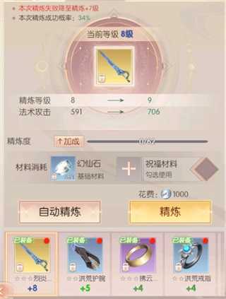 装备能够借助精炼获取额外属性。装备等级越高,其精炼等级上限越高,而且装备等级越高,品质越优,精炼所获得的属性也就越高。不过,精炼等级越高,成功率越低。精炼过程中必须消耗幻仙石作为材料,3级及以上的装备若精炼失败会降低1级。除了基础的幻仙石,还能同时添加祝福材料:精炼时放入天罡石,可将成功率提高15%;精炼时放入乾坤石,能让精炼失败时装备不降级。