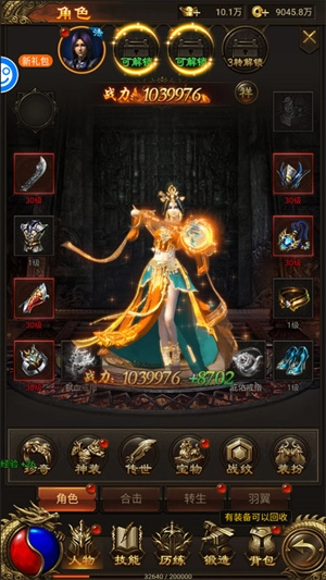 角色装备方面,共有11件角色件装备,此外还有8件基础装备、2个特戒以及1个官印。系统涵盖的功能包括特戒、神装、传世、宝物、装扮、战纹、角色、合击、转生和羽翼。