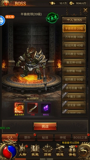 玩游戏的朋友都懂,无非是击杀BOSS掉落装备和材料这类常规玩法,这点无需多言。重点要说明的是,野外BOSS支持PK机制,只要参与击杀就能拿到奖励,其中首杀奖励最为丰厚;秘境BOSS的奖励仅归属最终击杀者所有;而BOSS之家则仅限VIP2及以上玩家挑战,刷新时间为每2小时一次。