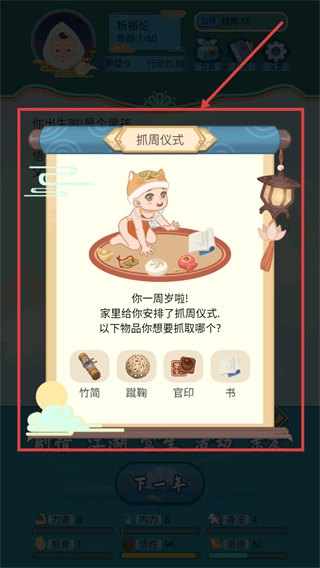 在抓周仪式上,要是选择了【蹴鞠】这件物品,就能增强角色的【内力】属性,这能给之后的武侠修炼筑牢根基,对角色的成长与发展起到推动作用。