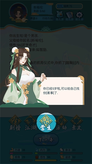 5岁那年,点击【营生】按钮去寻找差事,通过完成差事来积累资源,以此为角色的武侠之路提供支持与助力。