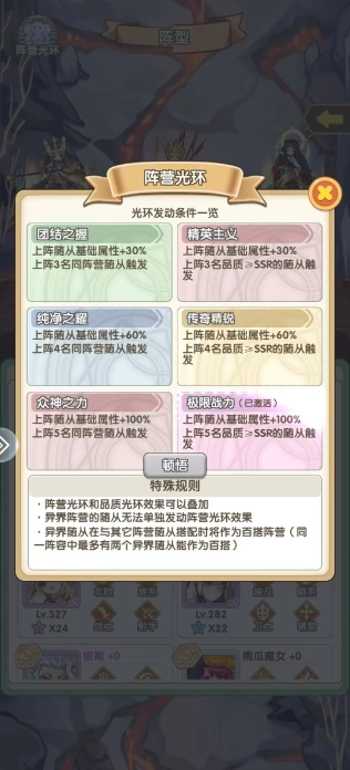 阵营中的元素光环和随从的阵营光环都十分关键,先聊聊元素光环。它由装备、精灵、宝具的11个空白栏位,以及6种属性触发共鸣构成——属性包括水火风土(光暗),也可以通过SSR数量组合触发。该光环需至少4个单位才能生效,最顶级的配置是11个栏位都为同一属性且均为SSR品质,这样就能享受两项满额加成。