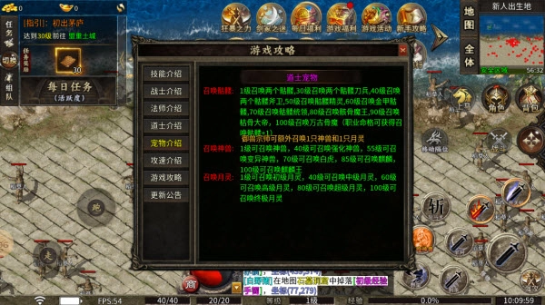 召唤神兽:1级时能够召唤神兽,40级可以召唤强化神兽,55级可以召唤变异神兽,70级能够召唤白虎,85级可以召唤麒麟,100级能够召唤麒麟王。