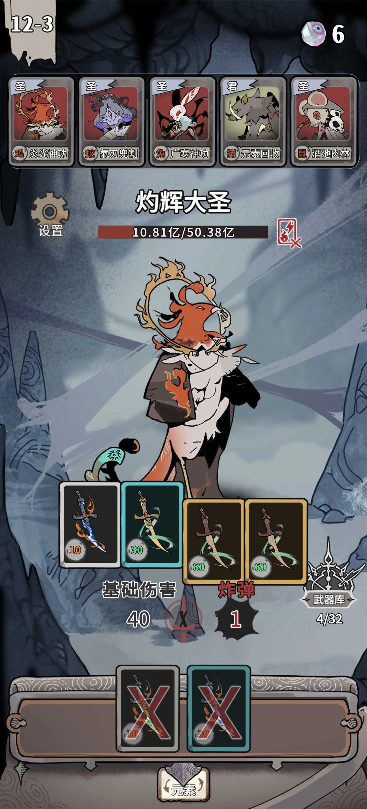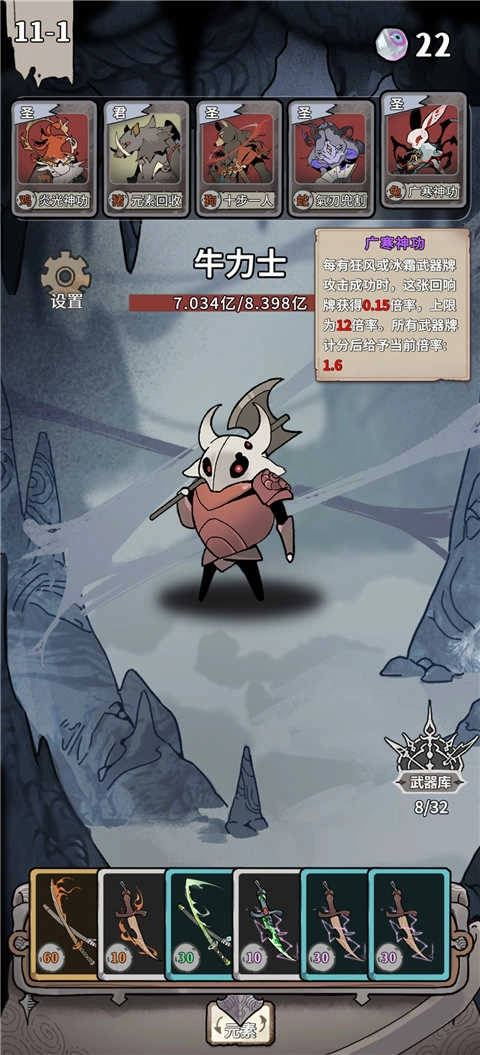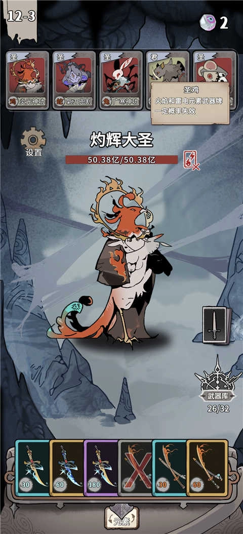 通关思路:移除太刀与匕首之外的全部卡牌,优先消除相同属性的卡牌,最后将注意力集中在最强属性上。