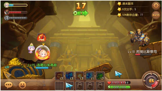 分析这张地图,通关难度不大。左边精英怪的血量比右边boss少,所以优先攻击精英怪能有效降低所受伤害。只要合理分配有效攻击次数,8次出手结束战斗并非难事。不过要注意,两个怪物的攻击力都很高,在2V1的局面下,想在8个回合内让它们血量过半,难度会比较大。