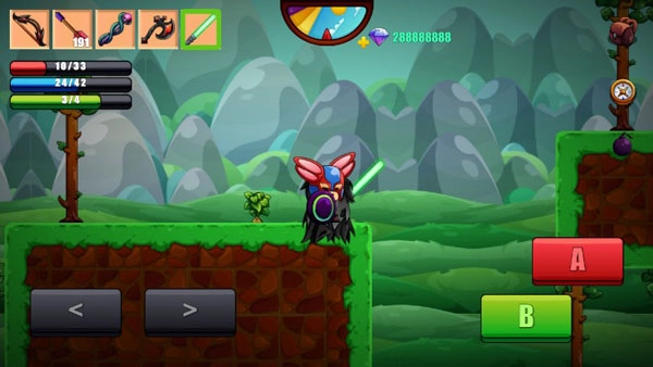 左侧控制左右移动,右侧负责跳跃与攻击,操作逻辑十分常规;左上方的五个栏位则是武器切换区域,选中想要使用的武器点击就能完成快速更换。
