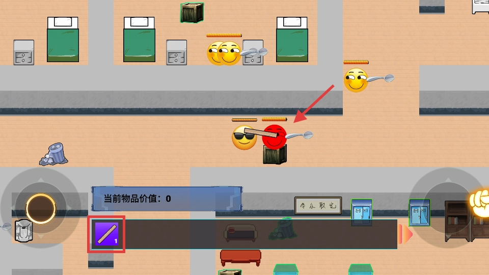 3、战斗过程中使用【紫色-刀】对敌人发起攻击,同时收集场景里的物品,关注【当前物品价值-0】的状态,警惕敌人的偷袭行为,确保自身能够生存下来。