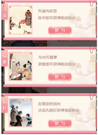 猜拳,投壶跟射灯灯,其中猜拳是无法预估的,小编曾经就试过全部输。投壶跟射灯灯是看你反应的,其中投壶分为三个壶,两个大的一个小的,大的插进去十分,小的二十分,所以我们假如选尽量选小的瓶子,这样你假如全中的话就有60分。还有就是射灯灯,射灯对反应迅速的人没有压力,假如全都点到了,也差不多有50分,但是我们得注意别点到有鞭炮的灯,还有一些两分的灯也尽量能把握住。所以综合所述,假如对自己有信心的,可以选择投壶,假如选择保险的就选择点天灯,当然你假如想跟系统玩闹的,可以选择猜拳