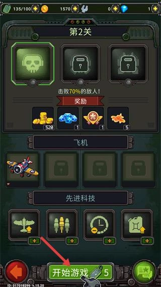 1、在第2关界面点击【开始游戏】按钮进入关卡,需完成“击败70%的敌人”的任务目标,同时可查看当前可用战机与科技。