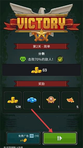4、关卡完成后,在结算页面点击红框内的绿色按钮即可进入下一关,继续挑战以赢取更多金币、钻石等奖励。