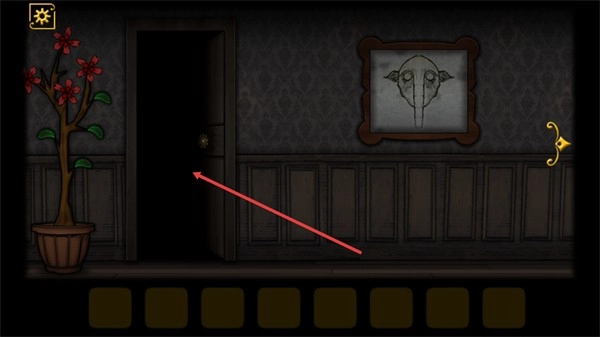 2、进入游戏场景后,点击打开的房门可进入下一个房间区域,该场景包含装饰画、植物等元素,是解谜流程的推进步骤。