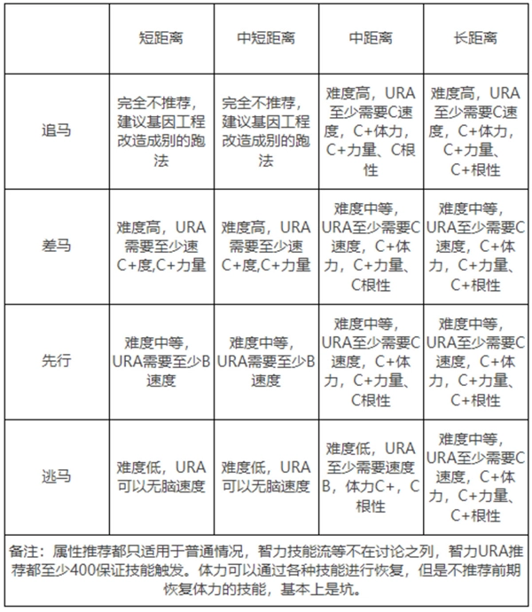 这张属性表上列出了育成成功所需满足的关键属性值条件,我们需要依据这些条件对马娘展开针对性训练。单从属性层面分析,在开服阶段的环境里,逃马的表现相对更为出色(此处仅参考纯属性流派,技能流暂不纳入考量范围)。