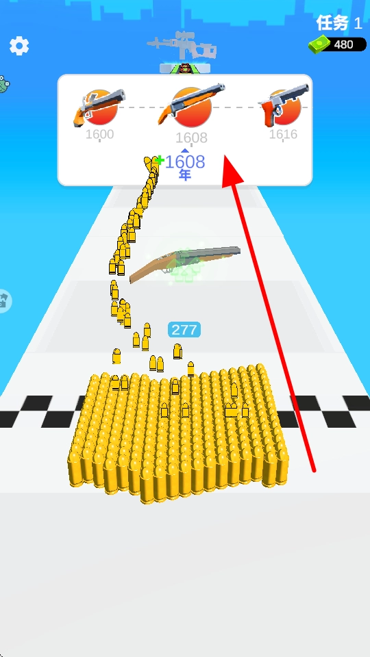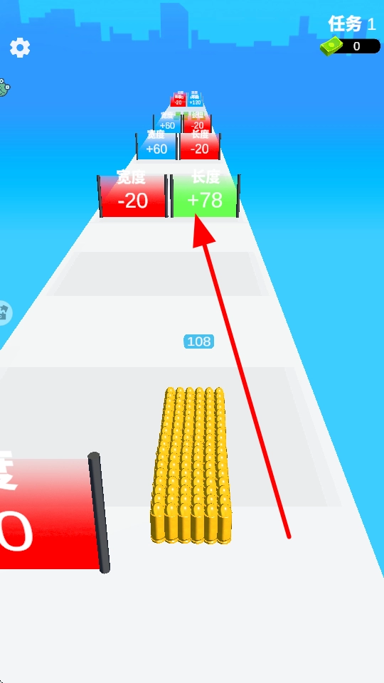 操控子弹堆向前移动,当经过绿色增益区域时,子弹的长度、宽度等属性会得到提升,从而使子弹堆变得更加庞大。
