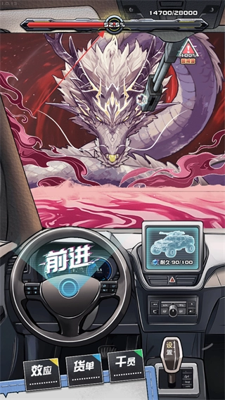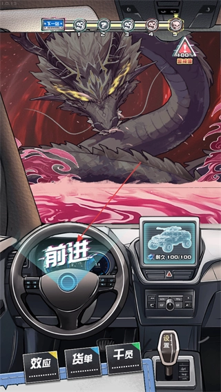 点击前进按钮启动车辆驶入道路,当遇到像龙形怪物这类强大的怪物时,留意其攻击的节奏规律。