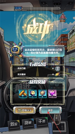 顺利到达目的地,在看到成功提示的界面后,点击领取按钮,就能拿到奖励,这些奖励可以用来升级车辆和装备。