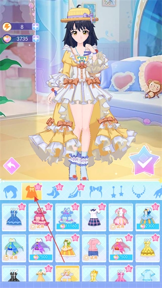 进入游戏的换装界面后,先查看左侧显示的等级8以及货币数量3735,接着点击下方服装分类里的“衣服”选项,为角色进行试穿操作。
