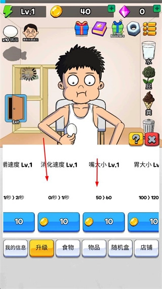 消耗金币可以升级咀嚼速度、消化速度、嘴巴大小、胃部容量等属性,以此增强角色在进食方面的相关能力。