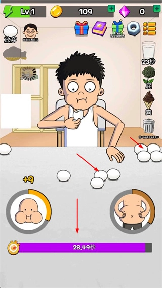 玩家可以通过操作角色与鸡蛋之类的物品进行互动,以此来积累金币等各类资源。
